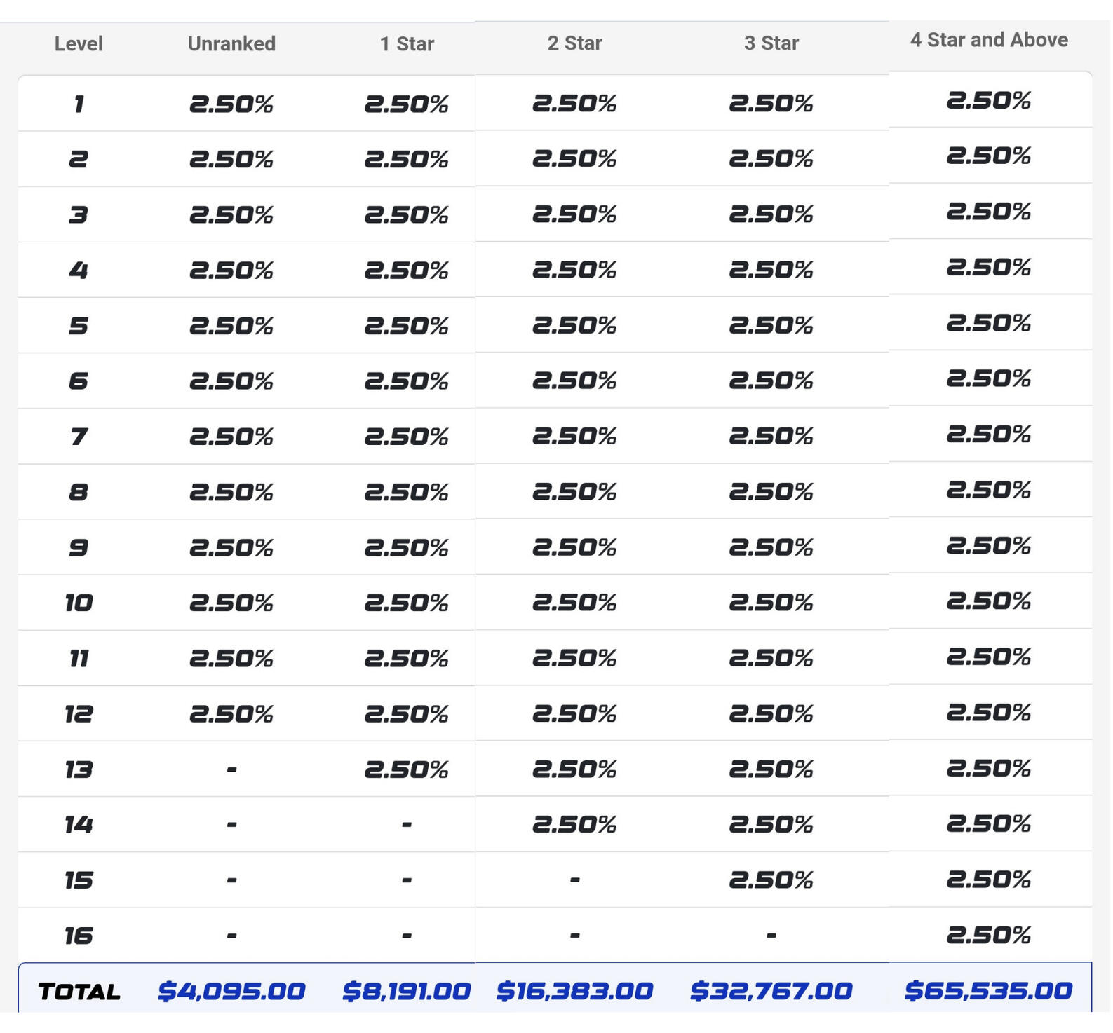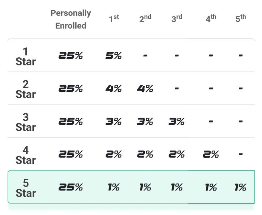 Sebagai contoh, jika anda adalah seorang Affiliate 4 Star, dan anda menaja secara peribadi seorang Ahli Affiliate baru, anda akan menerima 25% Personally Enrolled Fast Start Commission (Komisen Mula Pantas Tajaan Peribadi), DITAMBAH 5% Komisen Generasi Pertama 1 Star, DITAMBAH 4% Komisen Generasi Pertama 2 Star, DITAMBAH 3% Komisen Generasi Pertama 3 Star, DITAMBAH 2% Komisen Generasi Pertama 4 Star, menjadikan jumlah keseluruhan 39% (atau $31.20) daripada pendaftaran individu tersebut.