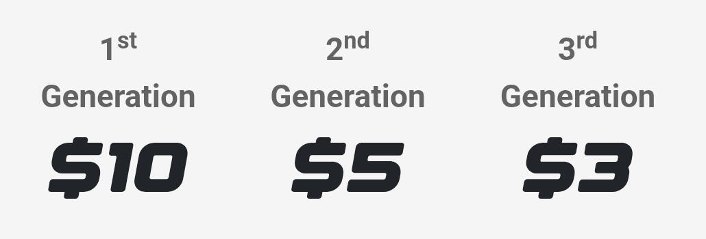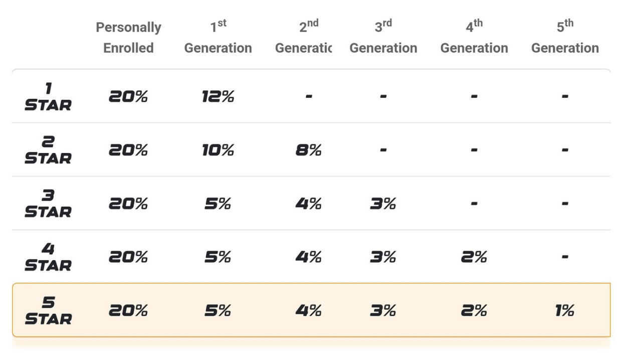 Coded Generational Fast Start Commissions adalah berdasarkan Generasi Pangkat dalam Rangkaian Penajaan Anda. Setiap pangkat yang lebih tinggi juga dikira sebagai satu generasi di bawah setiap pangkat yang lebih rendah. Ini bermakna, sebagai contoh, seorang Affiliate 3 Star juga dikira sebagai satu generasi di bawah pangkat 1 Star dan 2 Star.Jadi, sebagai contoh, anda berpangkat 2 Star, dan anda menaja seseorang yang membina pasukannya lebih pantas dan mencapai pangkat 3 Star lebih awal daripada anda, anda TETAP akan menerima Override 2 Star hingga Generasi Kedua sebanyak 4% ($3.20) bagi setiap orang yang ditaja oleh individu tersebut.Selain itu, anda juga boleh menjana sehingga 7% bonus sponsor apabila Affiliate di cabang Rangkaian Penajaan lain dalam organisasi anda yang menaja ahli baru!